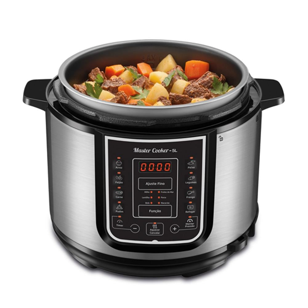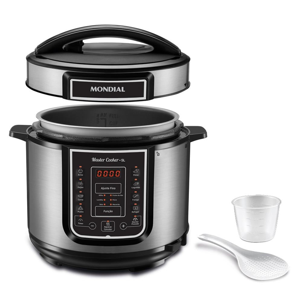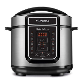 A Panela de Pressão Elétrica da Mondial tem a capacidade de 5L e painel digital com 14 funções programadas e ajuste manual do tempo. Ela desliga sozinha, mantém a comida quente e pode ser programada 24h antes. Ela prepara comidas como feijão, sopa, arroz, arroz integral, peixe, carne suína, carne, músculo, legumes, refogados e até doces. Sua cuba removível e antiaderente não gruda e é mais fácil de limpar. Sua tampa tem alça ergonômica, antitérmica e trava de segurança. Potência (W) 900